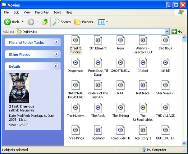 When you look at a tagged RatDVD file in the Windows explorer it displays the cover of the selected RatDVD in the taskpane on the left and once you switch to thumbnail mode, every RatDVD comes up with the associated DVD cover.